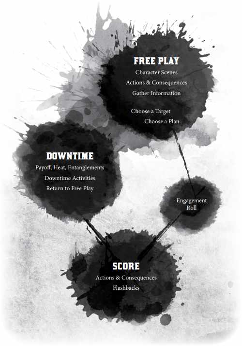 Blades in the Dark has the GM and players tell the story of a crew of criminals in a supernatural industrial city that powers everything with demon blood and ghosts. The crew has its own character sheet and over the course of the game will hopefully grow in power all the while making ‘friends’ and enemies. This goes for the player characters, scoundrels, too who will likely succumb to their vices. This is achieved through a game loop as follows: Free Play, Score, Downtime.